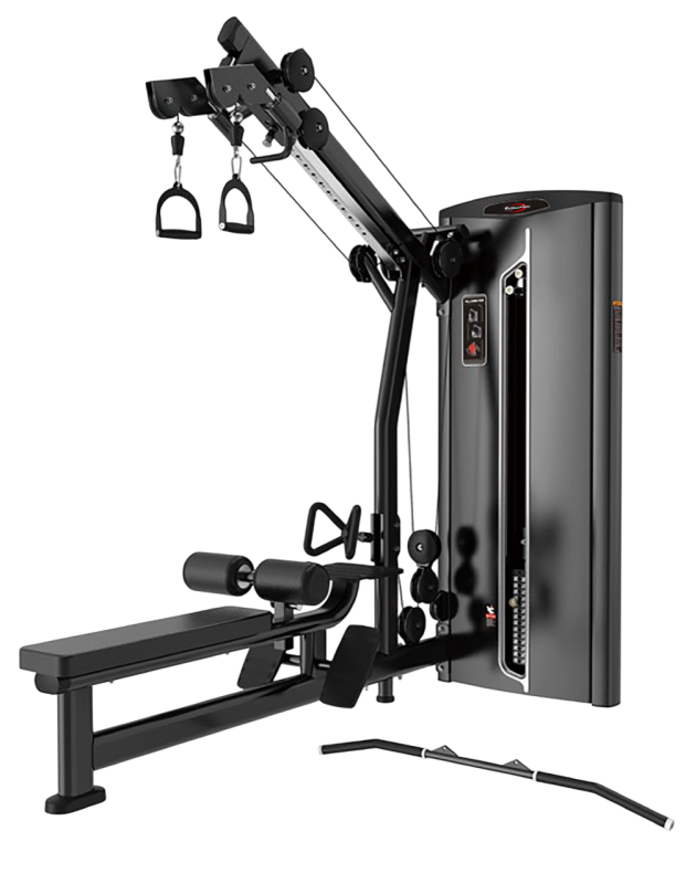 FUNCIÓN: La Polea Dual concentra jalón al pecho y remo bajo en una sola estación selectorizada, la torre de 96 kg con microcarga de 4,6 kg permite subir en pasos finos sin desarmar el setup.
